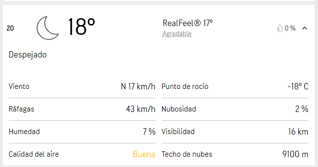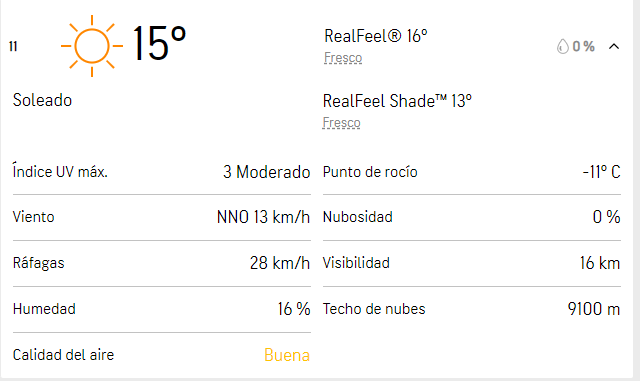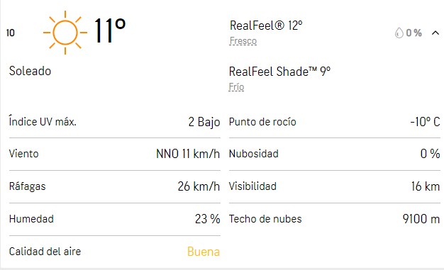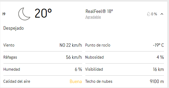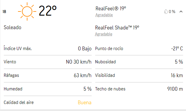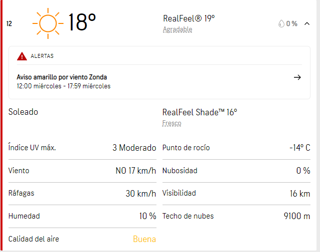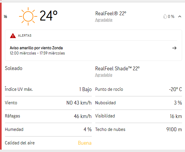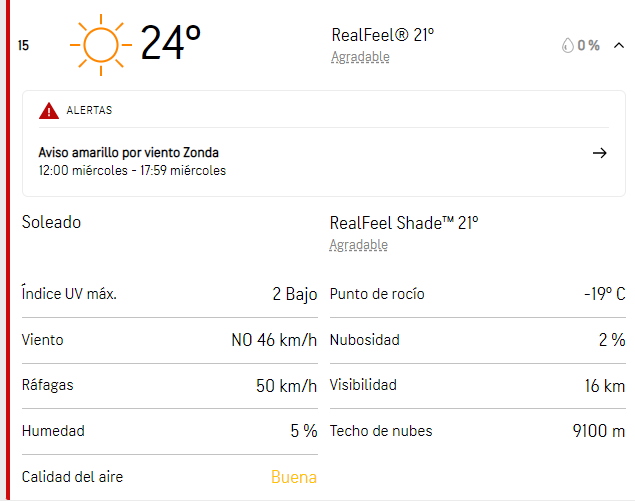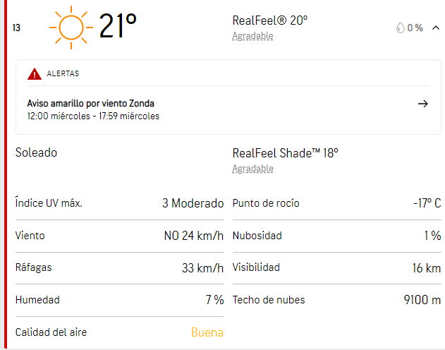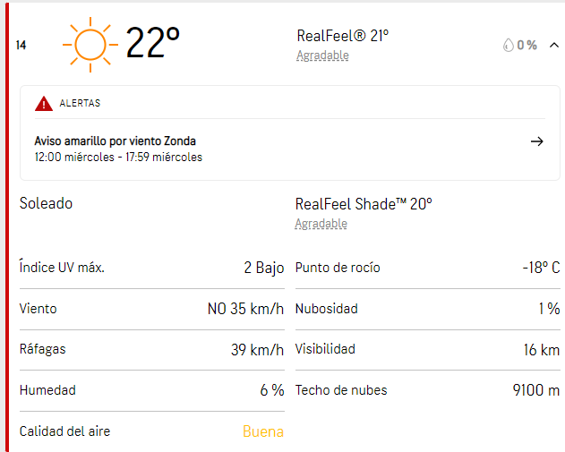 El servicio especializado en meteorología Accuweather, marca el inicio del alerta a las 12 e indica que el viento correrá con mayor velocidad a las 17, cuando tenga una velocidad de 37 kilómetros por hora con ráfagas de 52 kilómetros por hora.