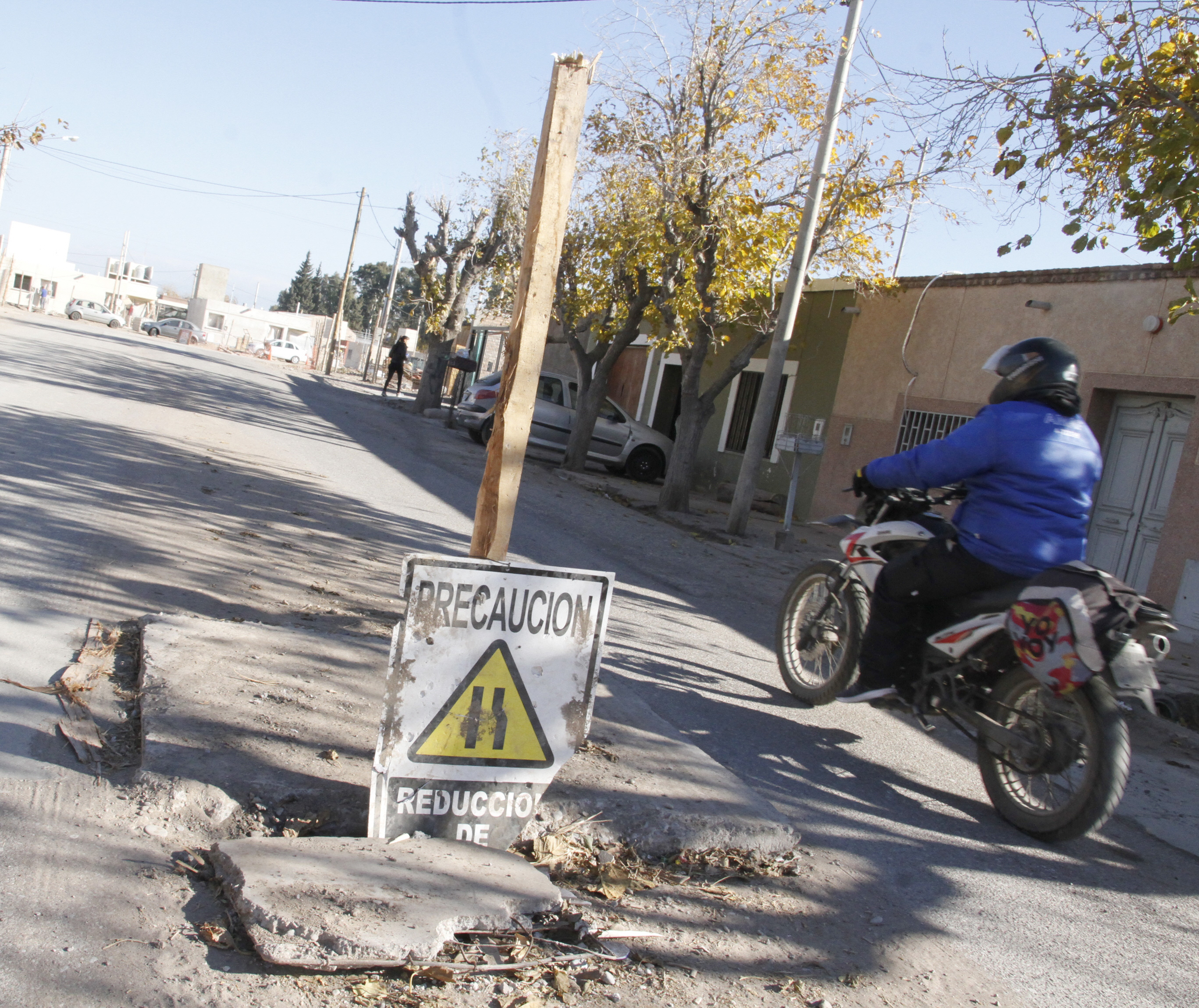 Según los vecinos de la calle todo comenzó hace tres meses cuando se rompió un caño. En el lugar el líquido cloacal rompió parte del pavimento. "Tras el arreglo del caño, vinieron a arreglar la calle y pusieron un parche de hormigón, que parece un bloque, pero que quedó elevado como 10 centímetros del resto del pavimento", dijo Carlos Aballay, un vecino de la zona, mientras que una mujer que pasa todos los días por esa calle definió ese parche como "una trampa mortal". Los vecinos dicen que obreros municipales pusieron ese parche. "En las noches esto es un peligro. No hay buena iluminación y si una moto llega a chocar contra ese parche puede pasar algo grave", dijo Florencia Carrizo, otra vecina.