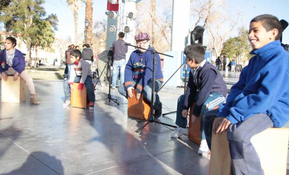 En la plaza Centenario de Villa Krause, en Rawson, también hubo música y baile. Pero en este caso los mismos chicos que asistieron al paseo fueron los protagonistas. Uno tras otro pasaron al escenario para formar la banda que tocaba congas y batucadas. Los integrantes del taller municipal de percusión les enseñaron a tocar diferentes instrumentos. Mientras los primeros chicos pasaron a tocar, el resto permaneció sentado y en silencio escuchando las lecciones para no cometer errores cuando les tocara el turno de sumarse a la banda.