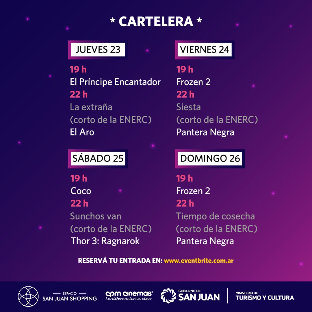 El autocine, la propuesta que ofrece el Ministerio de Turismo para disfrutar de diferentes películas, continúa este fin de semana pero en un nuevo domicilio. En esta oportunidad, los films se proyectarán en una pantalla gigante que se montará en la playa del estacionamiento del Espacio San Juan Shopping Center, en Rivadavia.