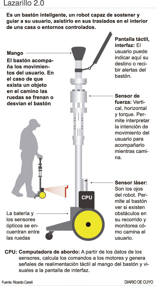Un equipo interdisciplinario de investigadores de la Universidad Nacional de San Juan (UNSJ) y del Conicet comenzó con este proyecto de crear un bastón robotizado, que puede cumplir un rol tanto de asistencia como de rehabilitación, que dio sus primeros pasos en el Instituto de Automática de la Facultad de Ingeniería.