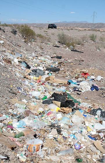 Pero siguiendo la ruta, es otro cantar. En ambas orillas hay de todo: animales muertos, comida, pedazos de plásticos, verduras, cajas de cartón, cubiertas viejas. Además, se puede encontrar cosas insólitas, como una tabla de planchar entera, un fuentón viejo lleno de botellas o un zapato muy largo que alguna vez usó un payaso. Y muchos de los cactus y las plantas de jarilla que crecen en medio de las piedras están cubiertos de bolsas.