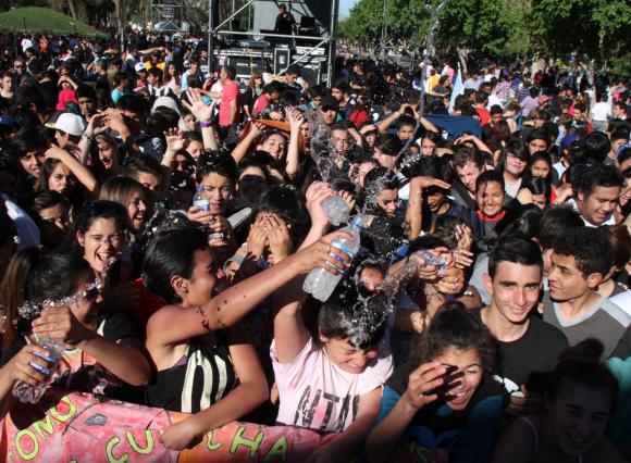 En 2012 la temperatura no pasó los 22ºC, estuvo nublado y sopló viento Sur. El año pasado, el frío opacó la fiesta con una máxima de 13ºC y una llovizna invernal. Ayer, el calor volvió y por eso, los chicos se movilizaron temprano. En el Parque de Mayo se congregó la mayor cantidad de gente. Hasta las 17, el panorama en ese espacio verde era tranquilo y se podía caminar sin inconvenientes. Pero el calor también agobió a la gente. Es por eso que los 6 puestos donde repartían agua gratis, estuvieron siempre repletos. Después de las 18, una multitud empezó a copar los sectores aledaños al escenario. La gente se quedó hasta que terminaron todas las actuaciones, que tuvieron un retraso de dos horas y comenzaron después de las 19.30.