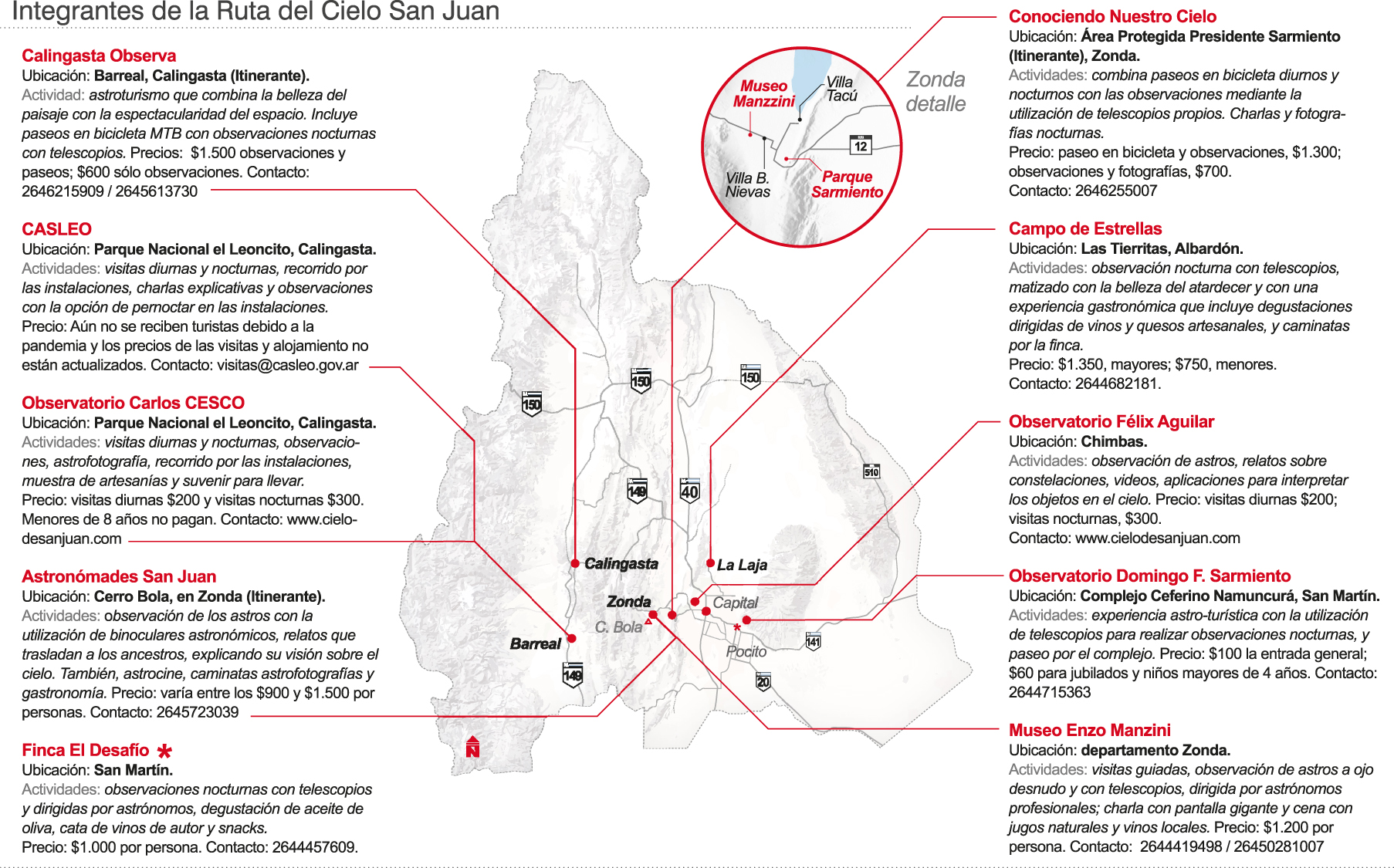 La ruta estará integrada por los observatorios astronómicos Félix Aguilar, Casleo (por el momento aún permanece cerrado al público) y CESCO que tradicionalmente ofrecen visitas guiadas y observaciones diurnas y nocturnas. Pero, también por prestadores que ofrecen observaciones de manera itinerante en fincas, cerros o áreas protegidas o en lugares pocos convencionales como museos (ver infografía). Todos ofrecen las observaciones nocturnas, con telescopios y dirigidas por profesionales, aunque algunos incluyen actividades extras como paseos en bicicleta, degustaciones y astrocine al aire libre. "Lo bueno de esta amplia y variada oferta de turismo astronómico es que toda la familia puede participar de las actividades, una condición que la hace más atractiva", dijo Juárez.