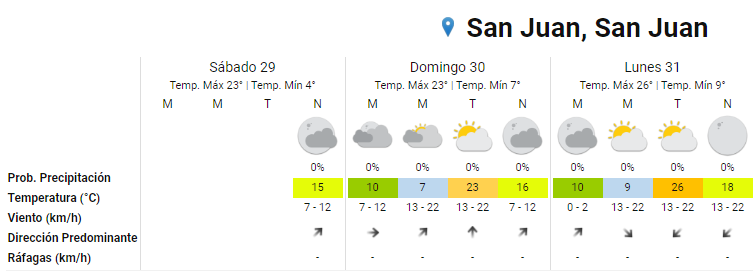 Luego de un sábado en el que la temperatura máxima en San Juan fue de 22,6 grados, hubo poca nubosidad y reinó la calma ambiental, el domingo se presenta con similares características, según indicó el Servicio Meteorológico Nacional (SMN).