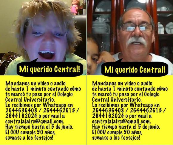 San Juan, 22 de mayo.- Para lograr un impacto masivo, tres exalumnos del colegio Central Universitario decidieron usar las innovaciones tecnológicas y armar un homenaje para la institución, que festeja sus 50 años. Iniciaron una convocatoria por WhatsApp en la que piden a otros alumnos que cuenten, a través de audio o video, cómo los marcó su paso por el colegio. Usarán el material para armar un especial multimedia que exhibirán en un acto y en las redes sociales.