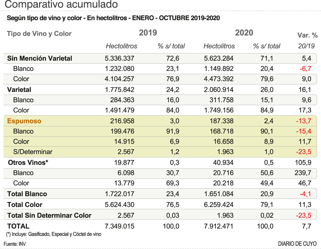 Según datos del INV, en octubre se registró un incremento en los despachos de vino al mercado interno del 1,3% a igual mes de 2019. En el acumulado de los diez meses el crecimiento fue del 7,7%. Pero, para el sector de los espumantes, por el contrario, las cifras son negativas. Para este segmento, la comercialización en el mercado interno cayó un 20%, respecto del mismo período de 2019. Si la comparación se hace con los diez primeros meses del año, de enero a octubre de 2020 la caída de los espumosos fue de 13,7%.