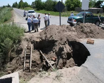 Los vecinos de la calle La Plata y la intersección con calle 4, en la zona rural de 25 de Mayo, se despertaron en la siesta con un fuerte estruendo: el puente que está sobre el canal de riego se desplomó. Por suerte, en ese momento no pasaba ningún vehículo por el lugar, porque el asfalto de la mitad de la calle La Plata, por la que circula el mayor flujo de vehículos y camiones en épocas de cosecha, quedó adentro de un pozo. Estiman que la reparación puede demandar unos 90 días y comenzarán a hacerla recién en el periodo de monda (en abril). Por eso, la Dirección de Hidráulica realizará un by pass para restablecer el sistema de riego que quedó cortado. Y la Dirección de Tránsito arreglará las calles que servirán como desvíos mientras se mantenga el corte.