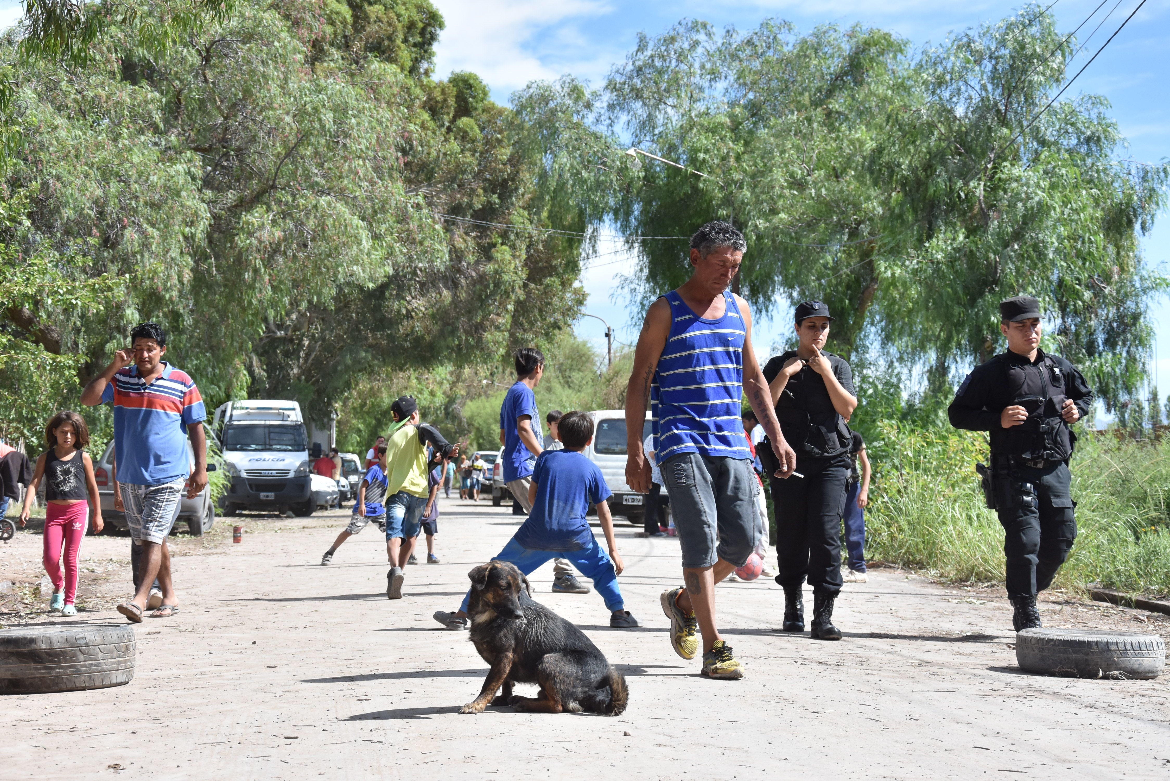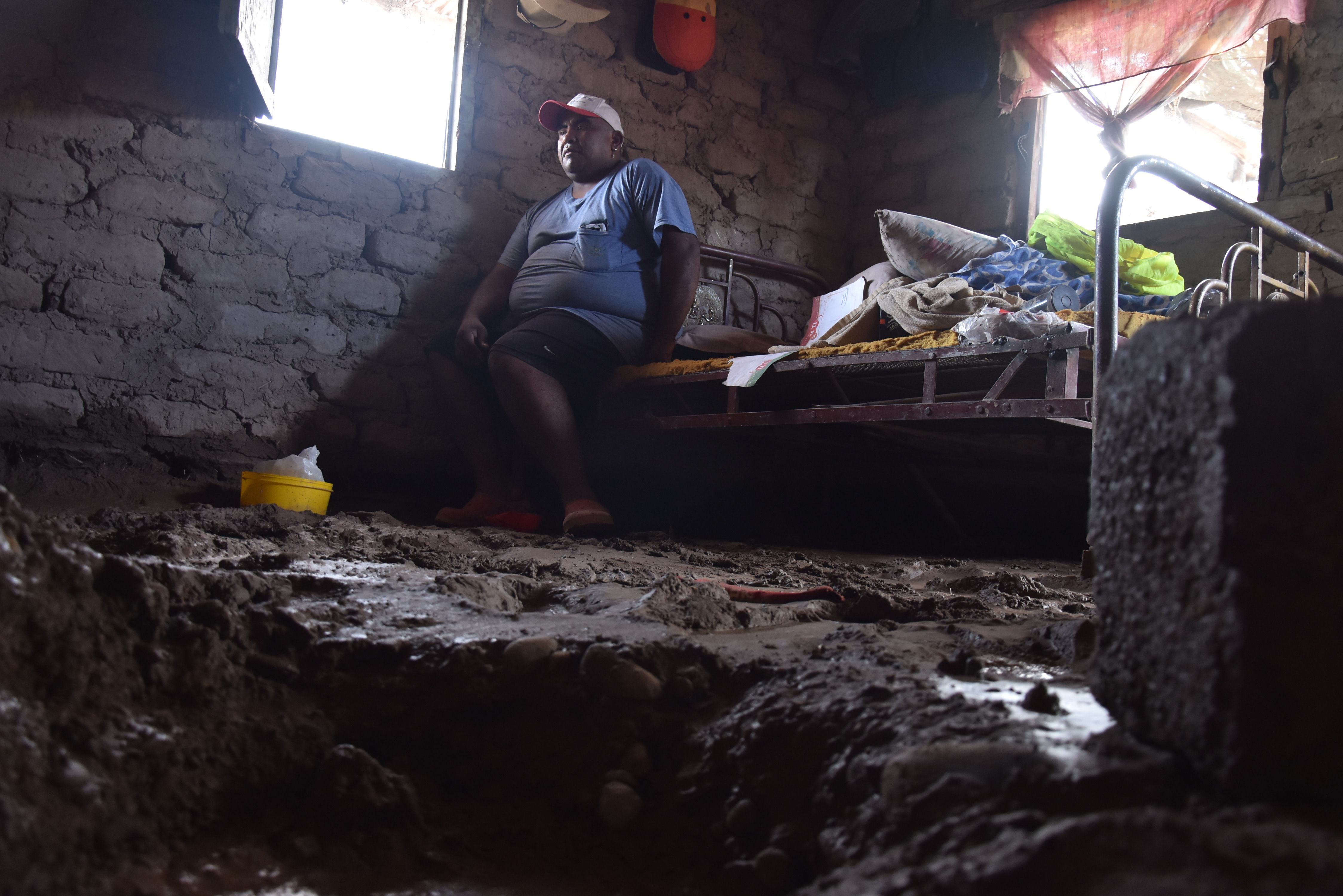 Al avanzar por la calle Pellegrini hacia calle 5, en La Bebida, Rivadavia, el panorama cambia de repente. Una cinta de peligro corta el paso, a su lado hay policías que preguntan el motivo y el nombre de quienes pretenden cruzar “la barrera”. Detrás ellos, en la banquina, algunos gazebos. Niños por todos lados, mujeres sentadas en ronda charlando, hombres mirando el panorama. Al costado hay barro, algunas construcciones de adobe con las bases carcomidas, paredes en el suelo y muebles desparramados. Así se ven este lunes los asentamientos Pellegrini y La Paz, en cuyos terrenos viven 190 familias, y que fueron de los más perjudicados por las lluvias de las primeras horas del domingo.
