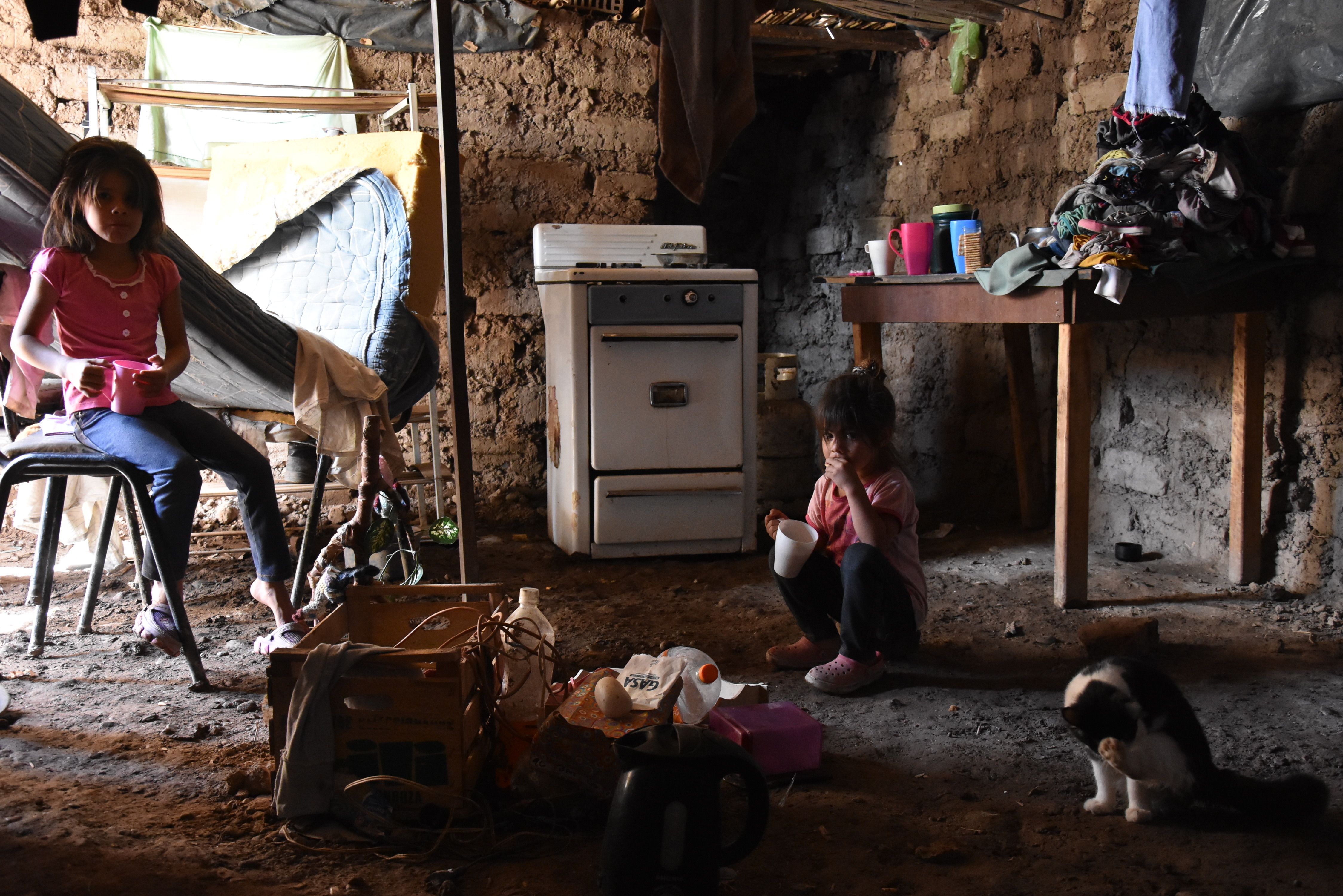 Postal dramática. El interior de una vivienda con el piso -de tierra- totalmente destrozado.