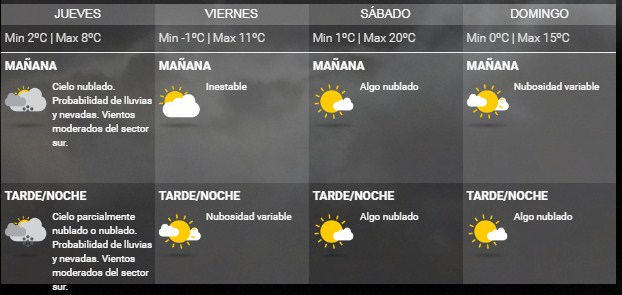 Según indica el SMN, tanto para la mañana como por la tarde se espera cielo parcialmente nublado o nublado. Probabilidad de lluvias y nevadas y vientos moderados del sector sur. La máxima sólo alcanzará los 8 grados.