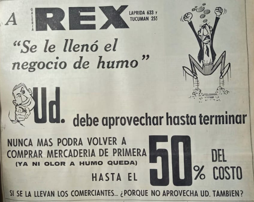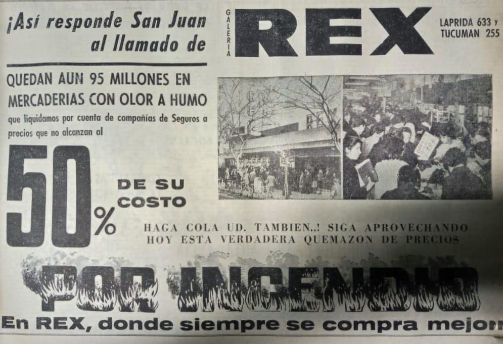 Casi desde el día posterior al incendio, el comercio de la tradicional Galería Rex comenzó a publicar en los diarios de la época anuncios en los que promocionaba, de manera muy ingeniosa, el remate de todo aquello que no tenía más que olor a humo. Incluso, se lo tomaron con mucho humor. “A Galería Rex se le llenó el negocio de humo. Nunca más podrá volver a comprar mercadería de primera (ya ni el olor a humo queda)”, rezaba uno de los avisos.