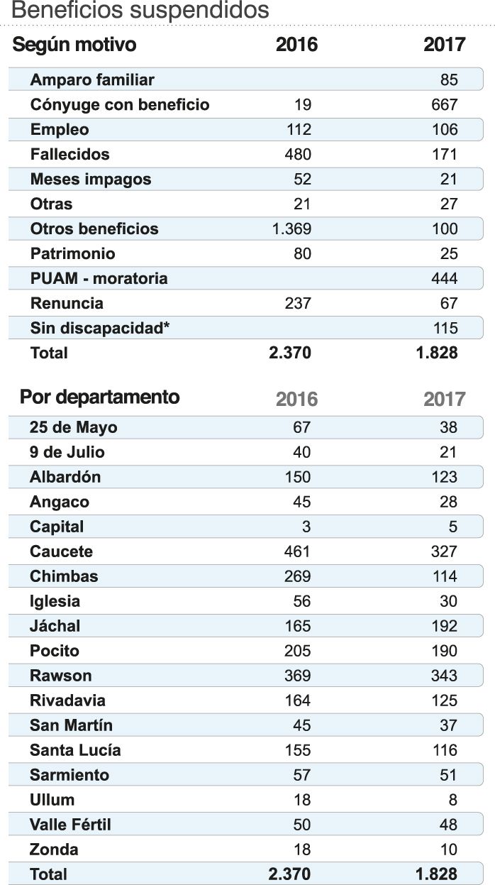 En 2016, San Juan tenía 38.430 pensiones no contributivas y de ellas perdió 2.370. Es decir que el 6% fueron dadas de baja. En 2017, la situación es similar, pero solamente en la primera mitad del año. Es que de las 37.213 pensiones, 1.828 (el 5%) fueron suspendidas por no cumplir con los requisitos. En paralelo dieron de alta sólo 555 beneficios nuevos. Es decir que por cada nuevo beneficiario, bajaron a más de tres.