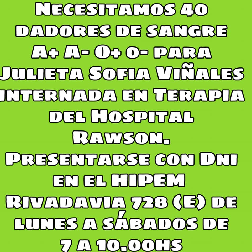 Ahora, Juli necesita la ayuda de todos, ya que se necesitan 40 dadores de sangre tipo A+, A-, 0+, 0-. Quienes puedan colaborar deben acercarse por la oficina del IPHEM, ubicada en Rivadavia 728 este, de lunes a sábado de 7 a 10 de la mañana.