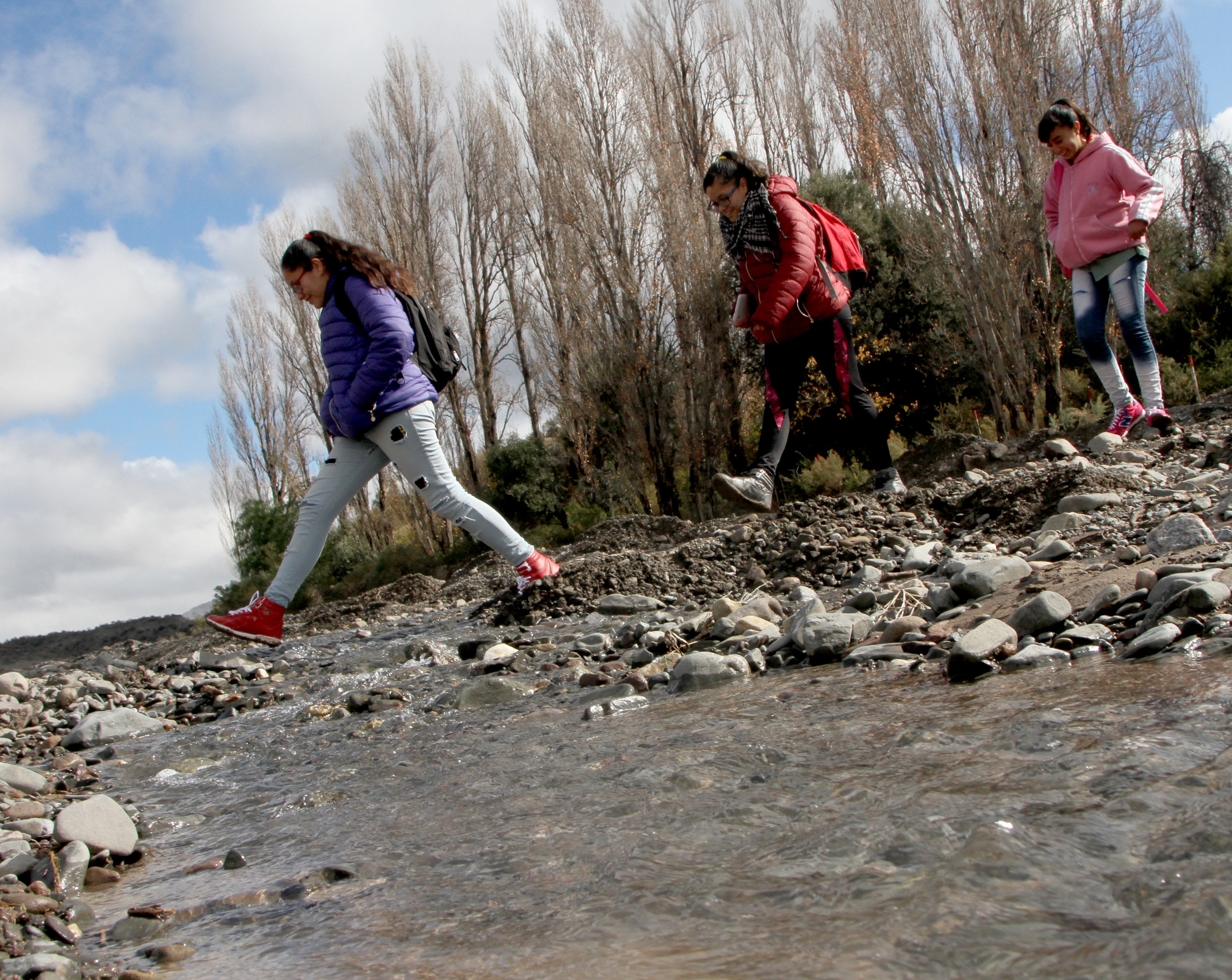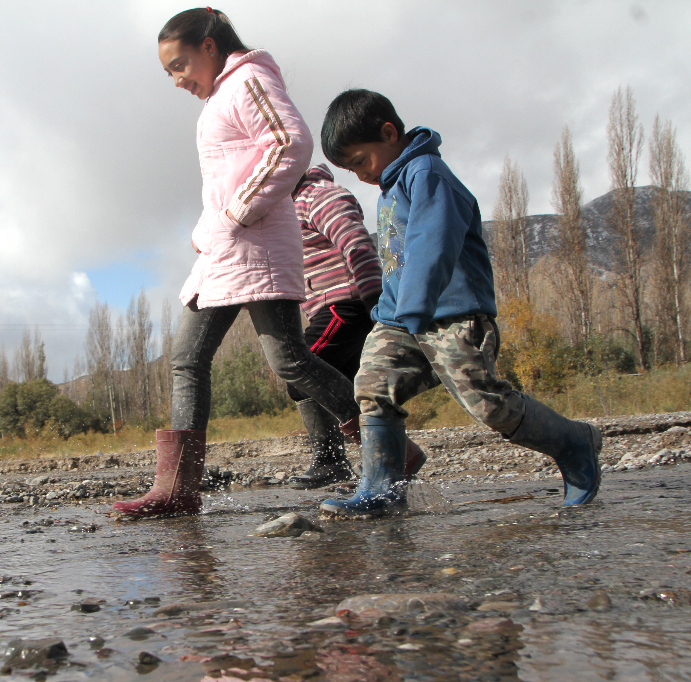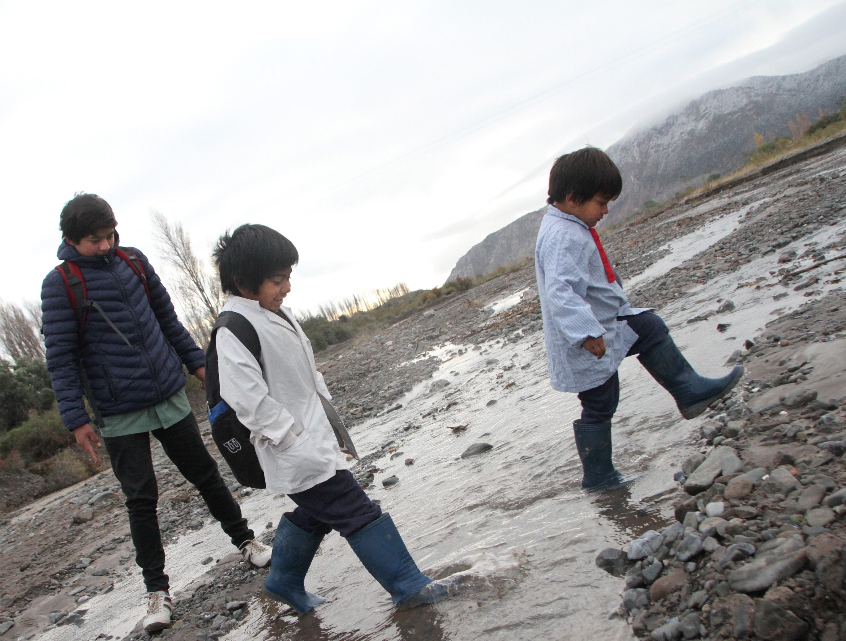 Atravesar el río suele ser una dura tarea para los chicos. Sobre todo para los más pequeños. Los jóvenes, que son los que no tienen botas, suelen atravesarlo a los saltos por los montículos de tierra o las piedras que hay en las orillas.