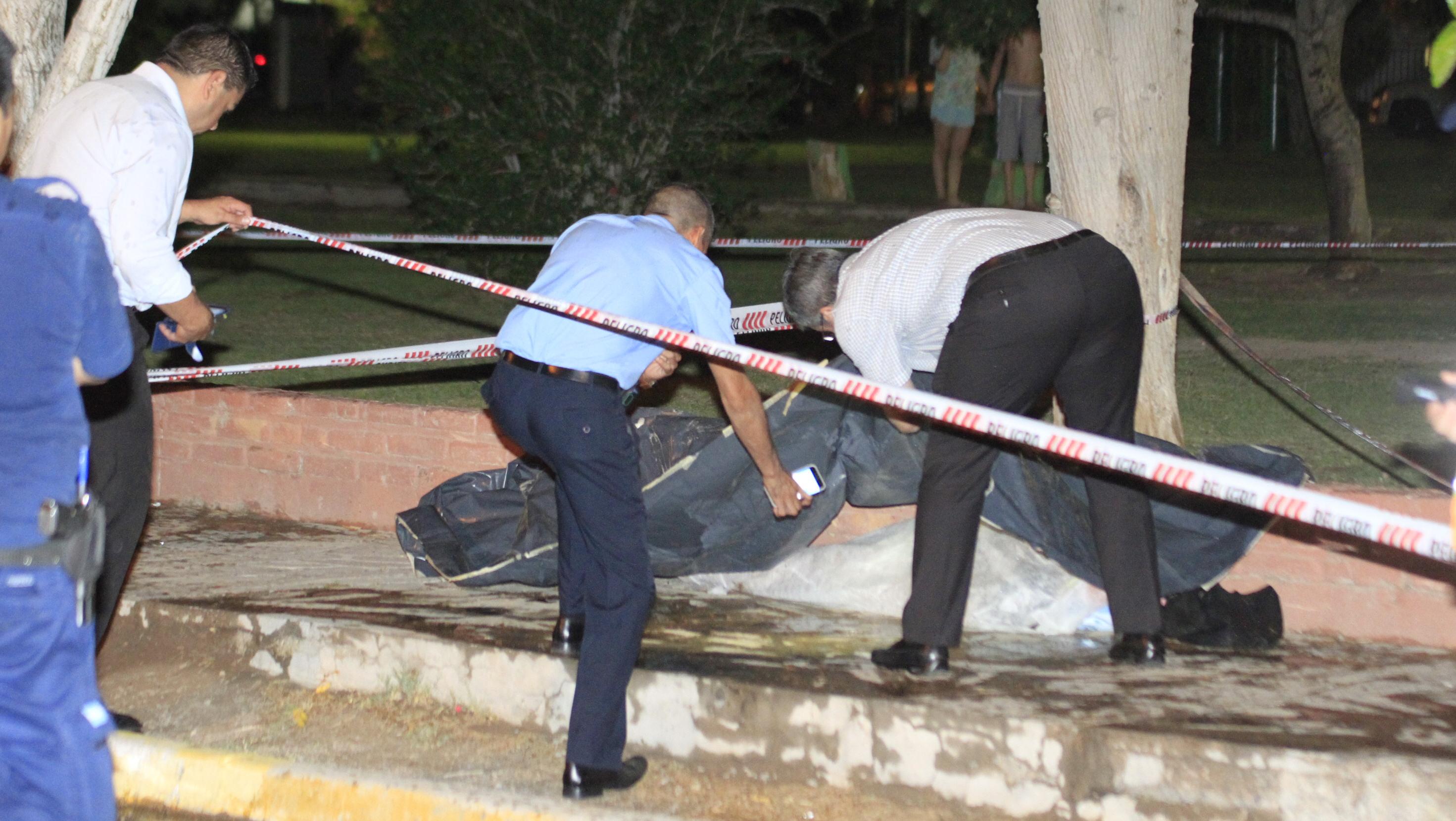 Dos jefes policiales intentaban inspeccionar el cuerpo que yacía en la plaza.