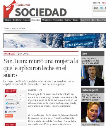 Luego de conocerse la muerte de Pabla Molina, a quien le suministraron leche por vena, según denunció si hija, Sonia Gutiérrez, la noticia cobró estado nacional y fue reproducida por medios de diferentes partes del país como Buenos Aires, Córdoba, Mendoza y Tucumán, entre otros.