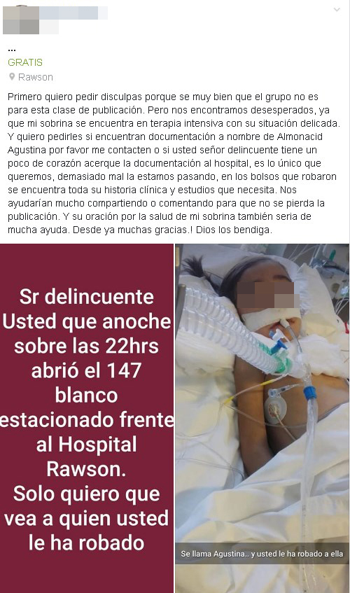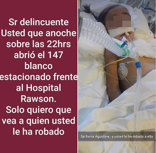 Paula, tía de Agustina, realizó una dura publicación en su cuenta de Facebook, en la que se ve a la menor hospitalizada. La joven y el papá de la criatura coincidieron: "Queremos que el mire a quién le robó".