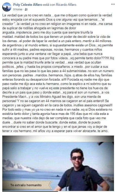 A poco más de 6 meses de la desaparición del submarino ARA San Juan, la hermana de uno de los submarinistas sanjuaninos escribió un duro mensaje en las redes sociales: “Ya no creo en nada”, aseguró.