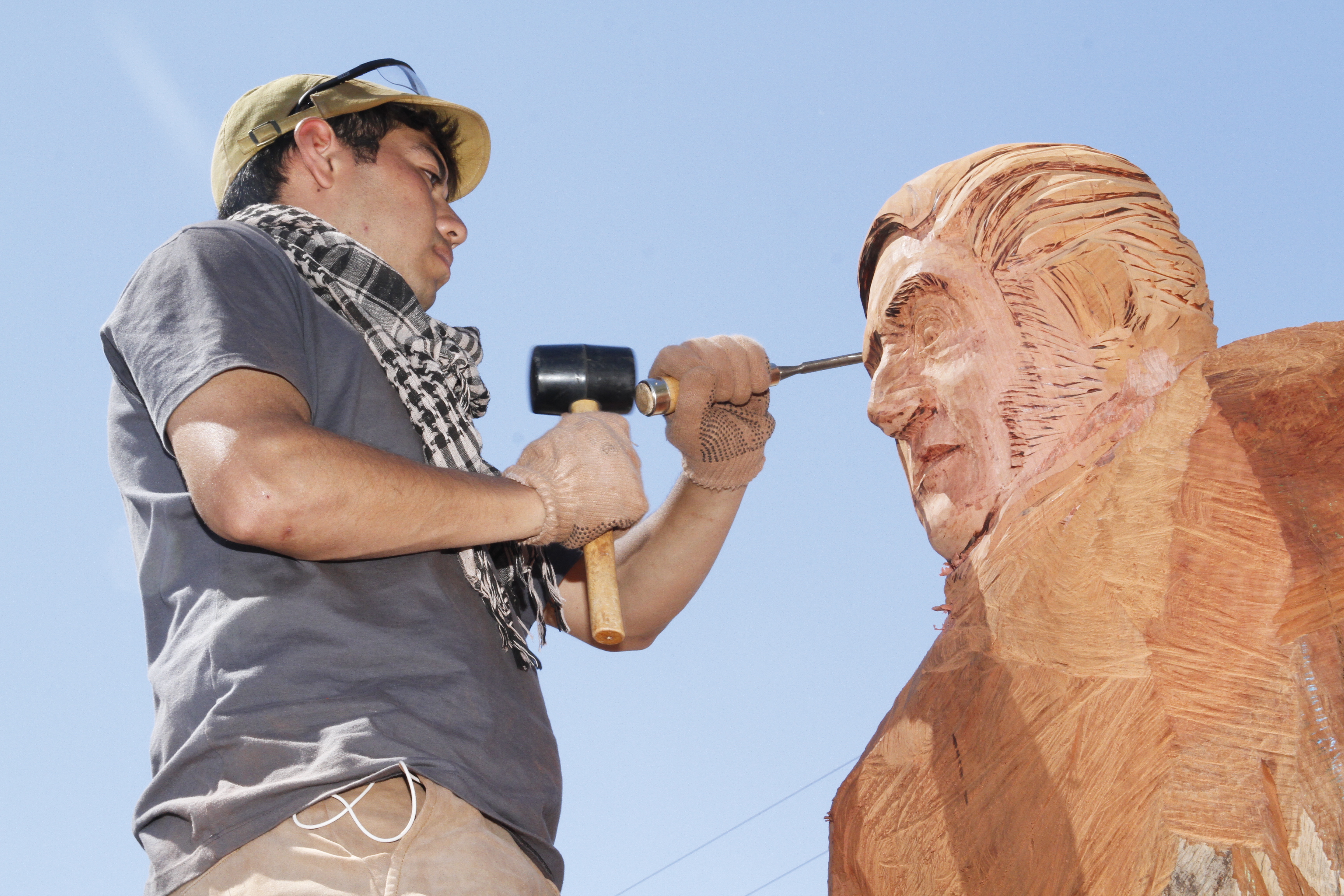 Ni el pleno sol ni la lluvia logran que se baje del andamio y abandone su trabajo. No es un albañil, sino un escultor que se dedica a transformar troncos de árboles viejos en verdaderas obras de arte. Se trata de Javier Lepez, de 26 años, que actualmente está en la plena tarea de tallar una imagen gigante del general San Martín en un tronco de eucalipto, que dará la bienvenida a la Casa de la Historia y la Cultura de San Martín. El joven, que cursa el último año de la carrera de Artes Visuales, se definió como un autodidacta que aprendió este arte sin asesoramiento de nadie y por la pasión de buscarle el lado bello a cada cosa.