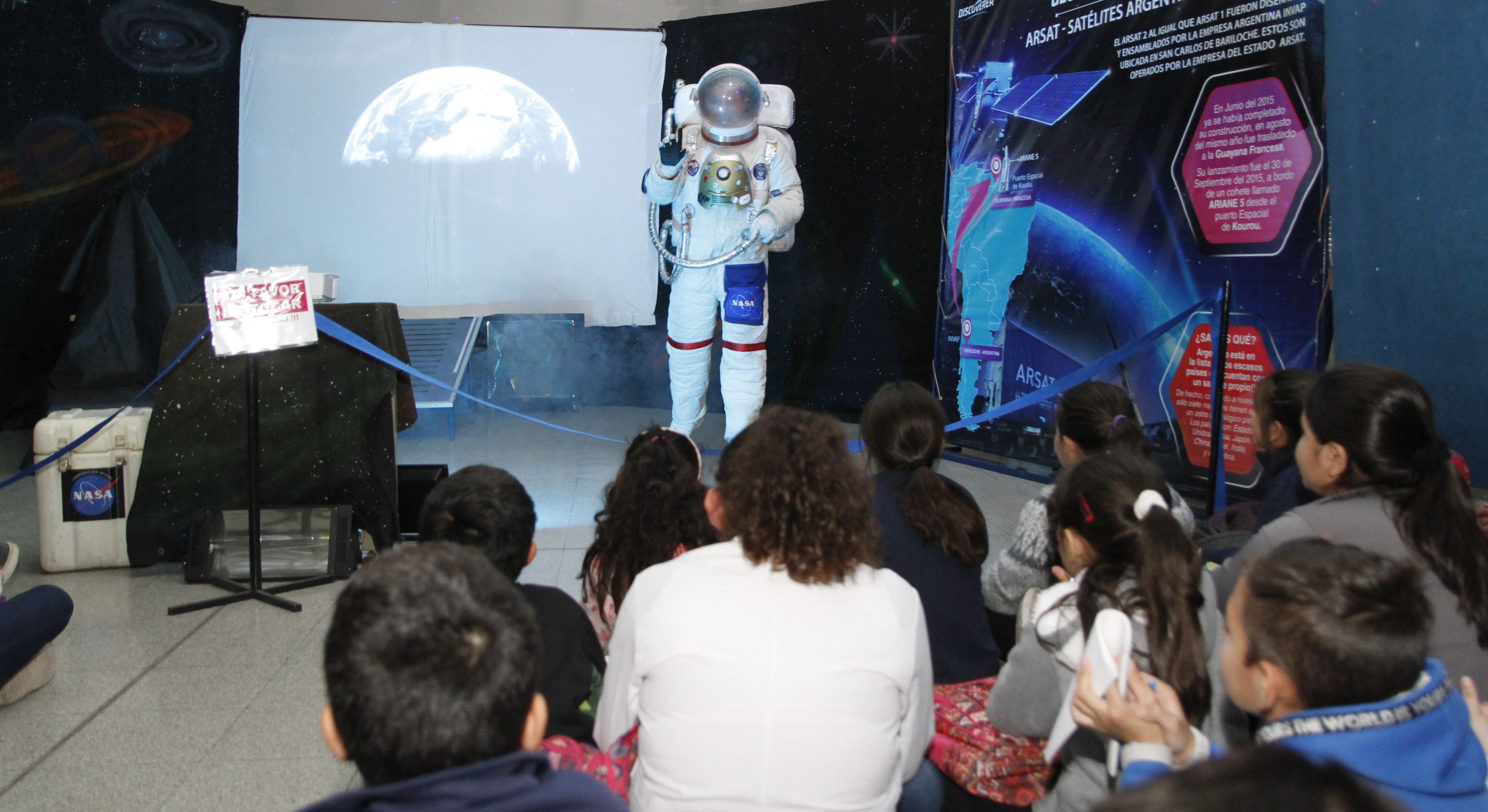 En un ambiente cerrado, con escasa luz azul y la música de la película Star Wars de fondo, se encendió la pantalla para comenzar con el video sobre la vida en el espacio. Los chicos contemplaron la introducción del documental en completo silencio, pero fue hasta que de manera inesperada un astronauta traspasó la pantalla e ingresó a la sala. En ese momento, volvieron a exteriorizar su asombro con una especie de suspiro. Algunos intentaron aplaudir la presencia del astronauta, pero el resto les pidió silencio para poder escuchar su saludo.