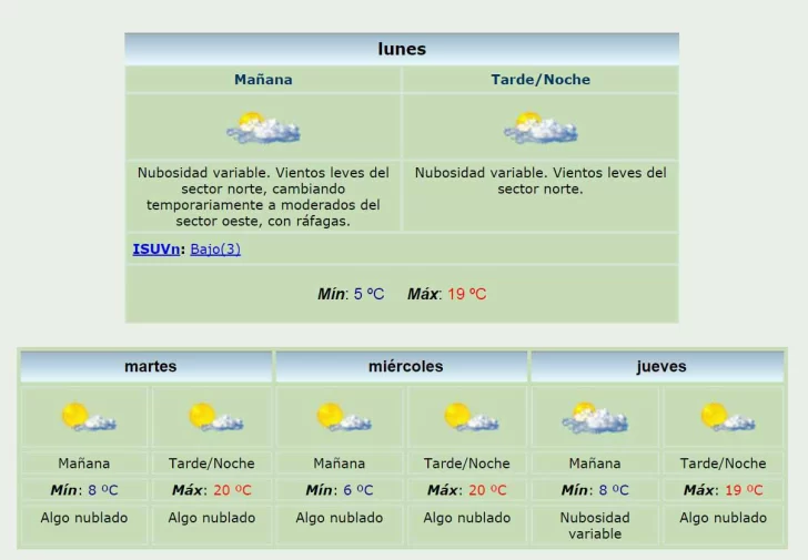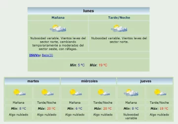 Por otro lado, la temperatura se mantendrá dentro de los 20 grados de máxima para el martes y el miércoles con mínimas que irán entre los 8 y los 6 grados respectivamente.