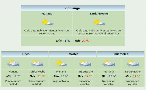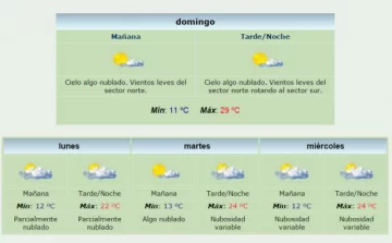 Se espera que el martes la máxima sea sólo unos grados más arriba llegando a los 24 grados, temperatura que también se espera para el miércoles. El cielo en los tres días estará parcialmente nublado.