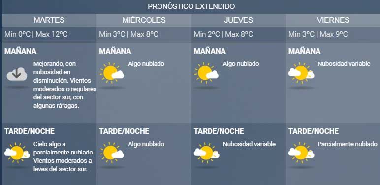 Para hoy el pronostico indica nubosidad en disminución y vientos moderados o regulares del sector sur, con algunas ráfagas.