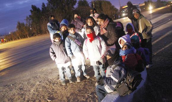 Todavía no sale el Sol y la pequeña llama se ve desde lo lejos a la orilla de la ruta 279, en Las Casuarinas. Cerca de una veintena de hombres se agacha a su alrededor con la intención de poner las manos cerca del calor. Tienen capas y capas de ropa, guantes, gorros y bufandas que les tapan la mitad de la cara. Distendidos, hacen bromas entre ellos para olvidarse de la temperatura bajo cero. Mientras tanto, miran hacia la calle, que por esas horas está casi desierta. Esperan ansiosos ver que se acerque el camión que los sacará de la ruta y el descampado y los llevará a trabajar en una plantación de viñedos.
