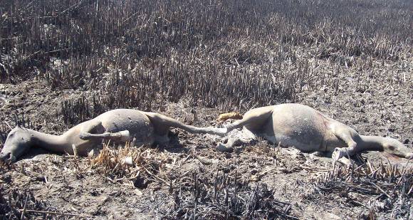Los 400 animales muertos son bovinos y caprinos, que pertenecían a las 9 familias dueñas de las fincas. A su vez, como en esos campos las pérdidas de pasturas fueron totales, la Municipalidad entregó fardos de pastos para alimentar a los animales que quedaron en pie, mientras que un veterinario atendió a decenas de ejemplares heridos.