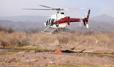 litros de agua acarrea cada helicóptero por viaje. Ayer sacaban agua del río de Los Bretes (donde improvisaron piletones) y del dique San Agustín.