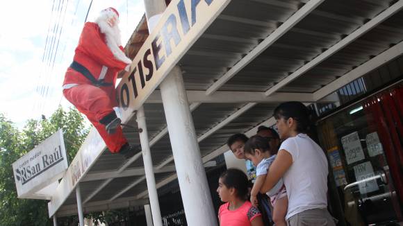 ’¡Pare, pare!’, gritó el niño y el chofer del colectivo frenó en seco pensando que algo malo le ocurría a algún pasajero. Pero no tardó en descubrir que la euforia del niño se debía a una imagen que cautivó todas las miradas. Era un Papá Noel, colgando del techo de una casa. No se trataba de un hombre disfrazado con el típico traje rojo y la barba blanca, sino de un muñeco del tamaño de una persona que una vecina hizo para decorar su negocio con temática navideña. La imagen es tan real que hace que tanto los niños como los adultos se frenen para mirarla y tomarle fotos.