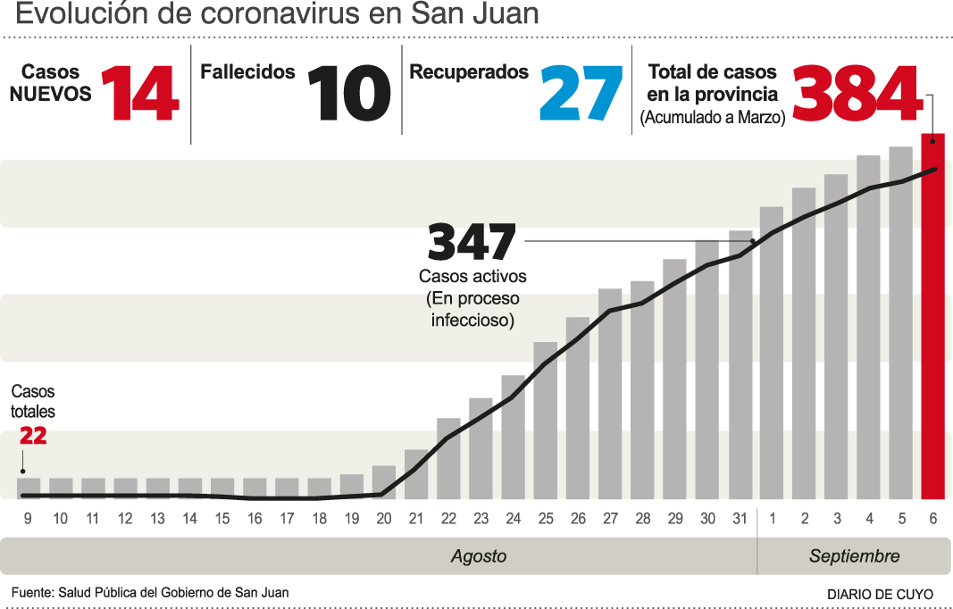 El parte vespertino emitido por el Ministerio de Salud Pública dio cuenta de 14 nuevos casos de coronavirus en la provincia. Sin registrar nuevos fallecimientos y con la confirmación de un nuevo recuperado, la cifra de casos confirmados en la provincia ascendió a 384. De esta manera San Juan lleva dos días sin registrar fallecimientos a causa de Covid-19. La primera muerte se comunicó el 24 de agosto y fue un hombre de Caucete, de 74 años; el sábado 29 hubo dos muertes: un anciano del geriátrico de Rawson y una mujer de 92 años oriunda de Caucete. Un día después, llegaría el cuarto fallecimiento: un hombre de 88 años también del geriátrico. La quinta muerte se produciría el martes 1 de septiembre y fue un hombre de Capital de 94 años. El viernes fue el día con récord de fallecimientos diarios con 5 muertes por coronavirus: una anciana de 95 años; un hombre de 84 años oriundo de Caucete, un hombre de 86 años que también era residente del geriátrico, otra persona de 56 años y un hombre de Caucete de 76 años.