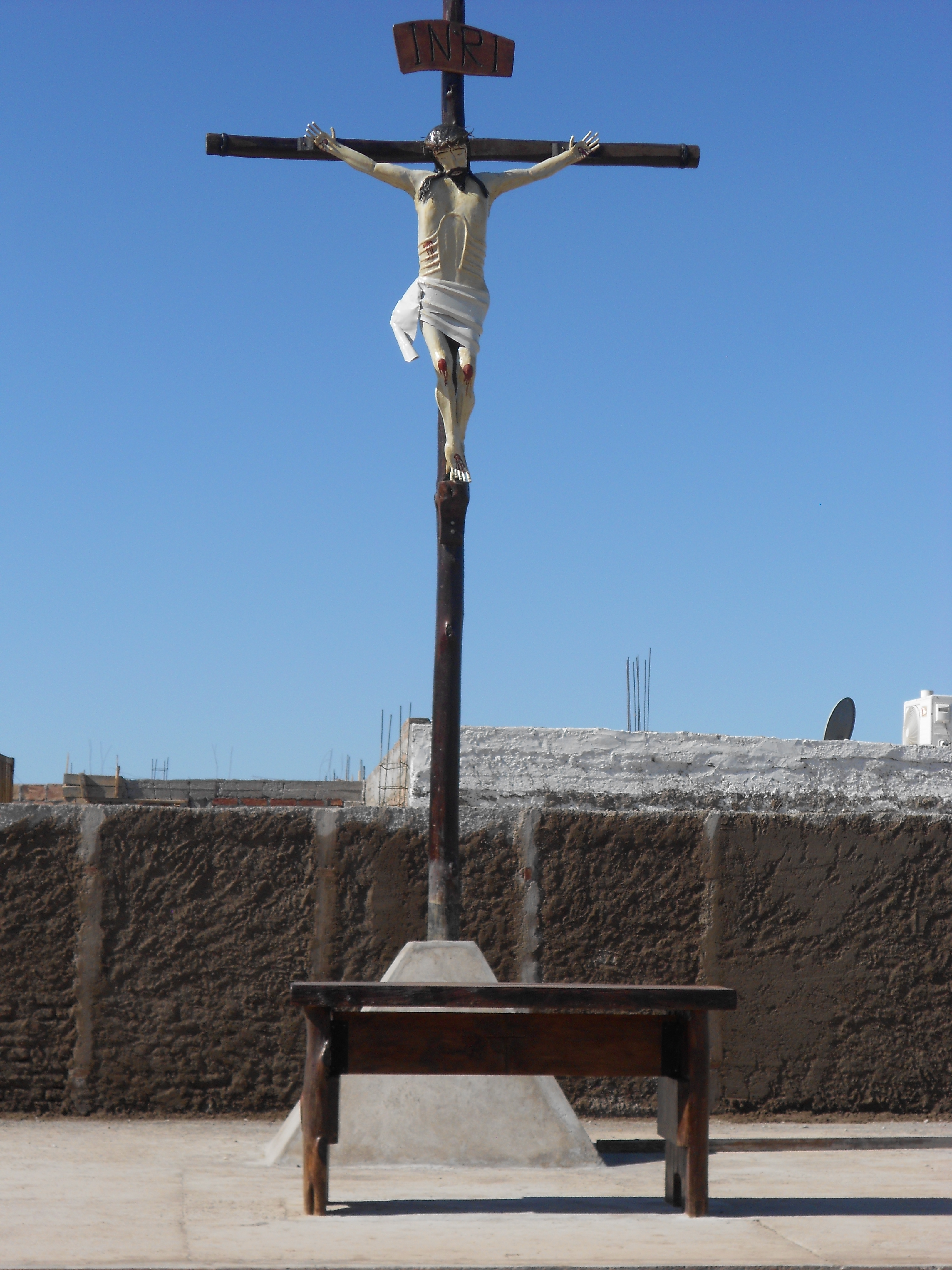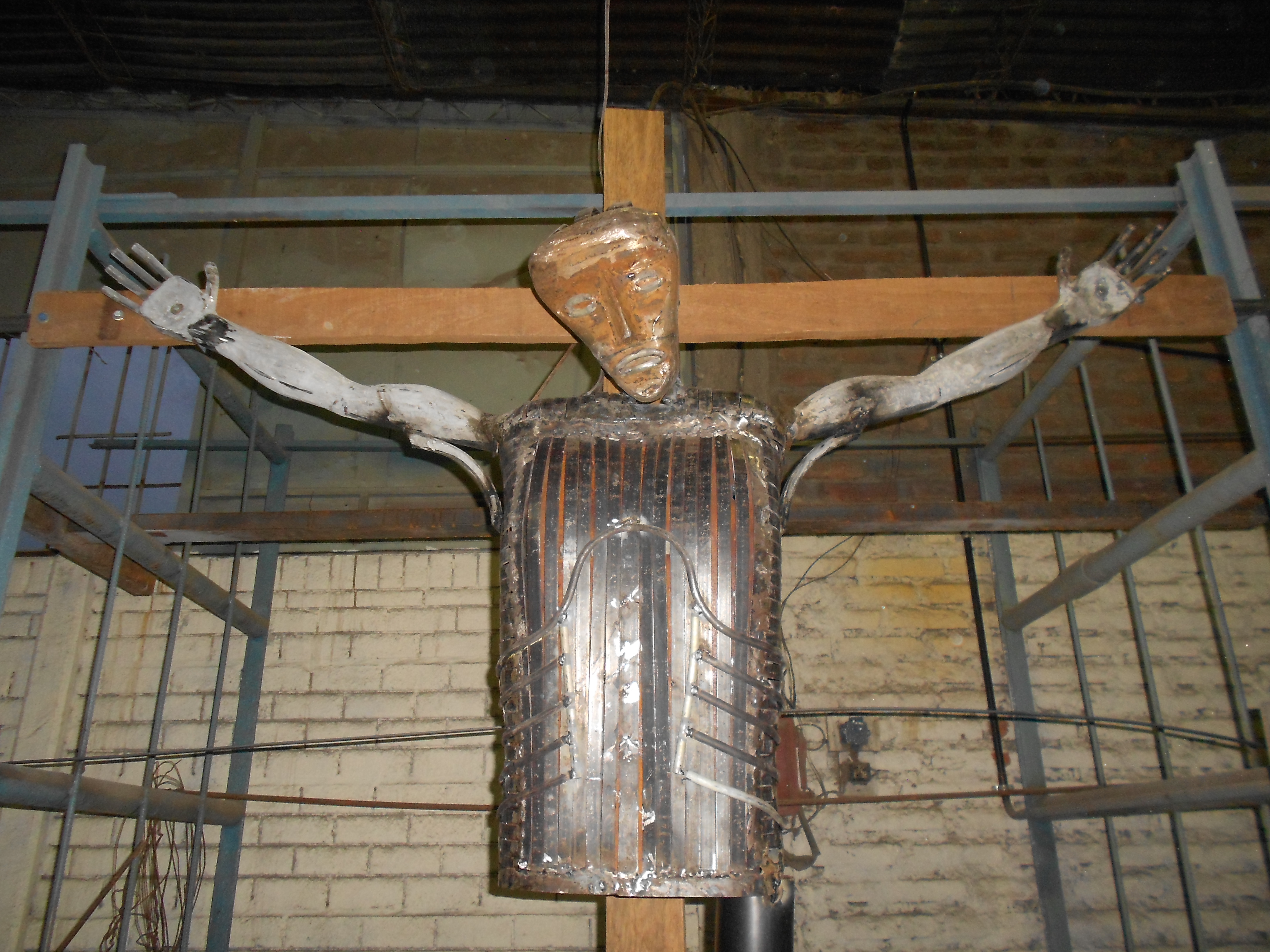 Unos 120 kilos entre planchuelas de metal, chapa y alambre. Recina poliéster, talco industrial y pintura. Soldadora y moladora. Una lija. Dos palos. 30 días. Y mucho esfuerzo y dedicación. Con eso, Alberto Rivera se las ingenió para construir un imponente Cristo crucificado de dos metros que fue colocado este jueves en una plaza del Loteo Díaz, en Chimbas.
