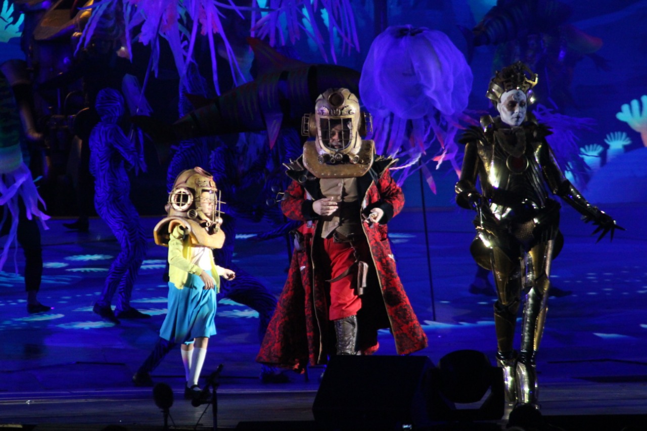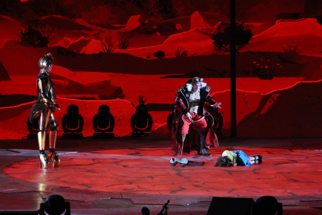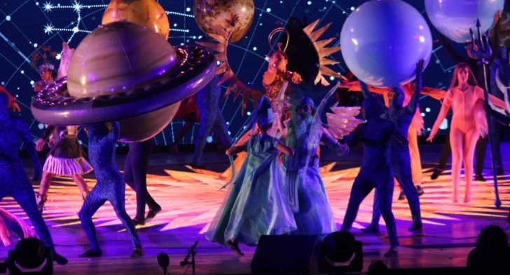 Entre bailes, imágenes impresionantes, trucos y el grupo fue recorriendo distintos cataclismos: como el Pérmico (una de las partes de la Era Paleozoica que comenzó hace unos 300 millones de años, en la que se provocó la extinción del 93 por ciento de las especies marinas y terrestres existentes y se generaron importantes cambios climáticos); luego la etapa del Vulcanismo (que significó la aparición de volcanes por todo el territorio, lo que será interpretado con volátiles efectos de aire y telas tanto en las pantallas móviles como en la actuación); y finalmente aterrizaron con la nave a Ischigualasto, en pleno Triásico, etapa clave en la aparición de los primeros mamíferos, que dio lugar en el escenario a la aparición de los personajes que representaron a distintas especies de dinosaurios, para pasar luego a Baldes de Leyes, en Caucete, donde fueron halladas las vértebras del dinosaurio que permitió descubrir el fenómeno del gigantismo en la especie.