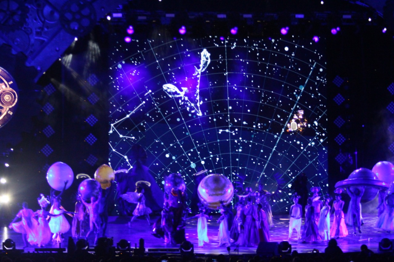 Con música original y voces en vivo por primera vez en la historia del show final de la fiesta, 550 artistas se movieron sin pausa y con gran expresión frente al enorme arco con engranajes internos de relojes que dominó la escenografía.