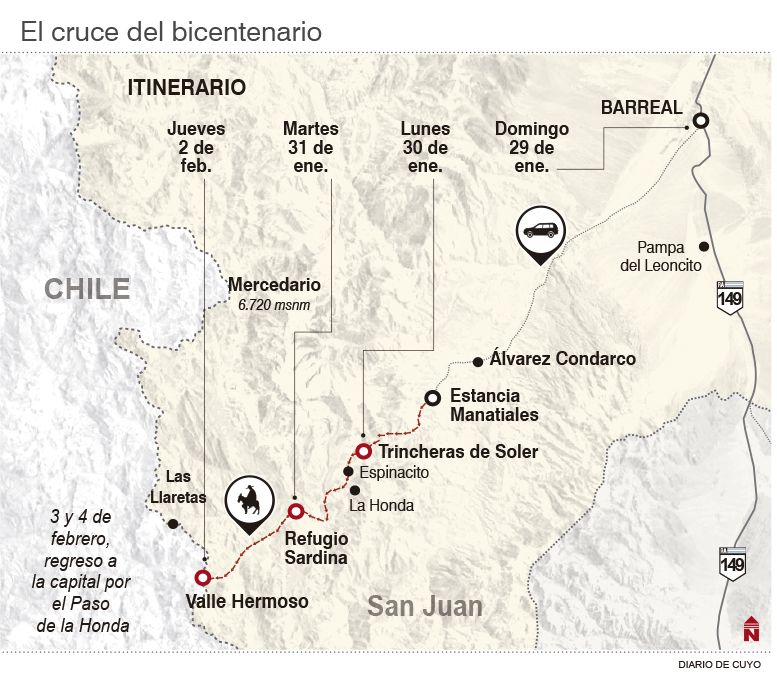 Está previsto que las columnas que avanzarán por Los Patos, en San Juan, y Uspallata, en Mendoza, lleguen hasta el límite con Chile y que representantes de ambas formaciones, con soldados argentinos y chilenos, avancen hasta Chacabuco para el acto central, el 12 de febrero.