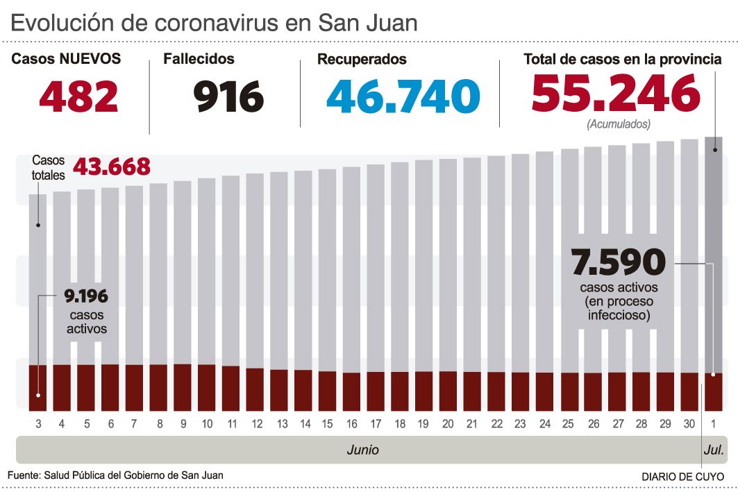 Por otro lado, hubo 482 nuevos casos y el acumulado ya tienen 55.246 infectados. Los pacientes con proceso infeccioso son 7.590 y de ellos hay 242 internados (124 están en terapia intensiva, 61 con respirador artificial).