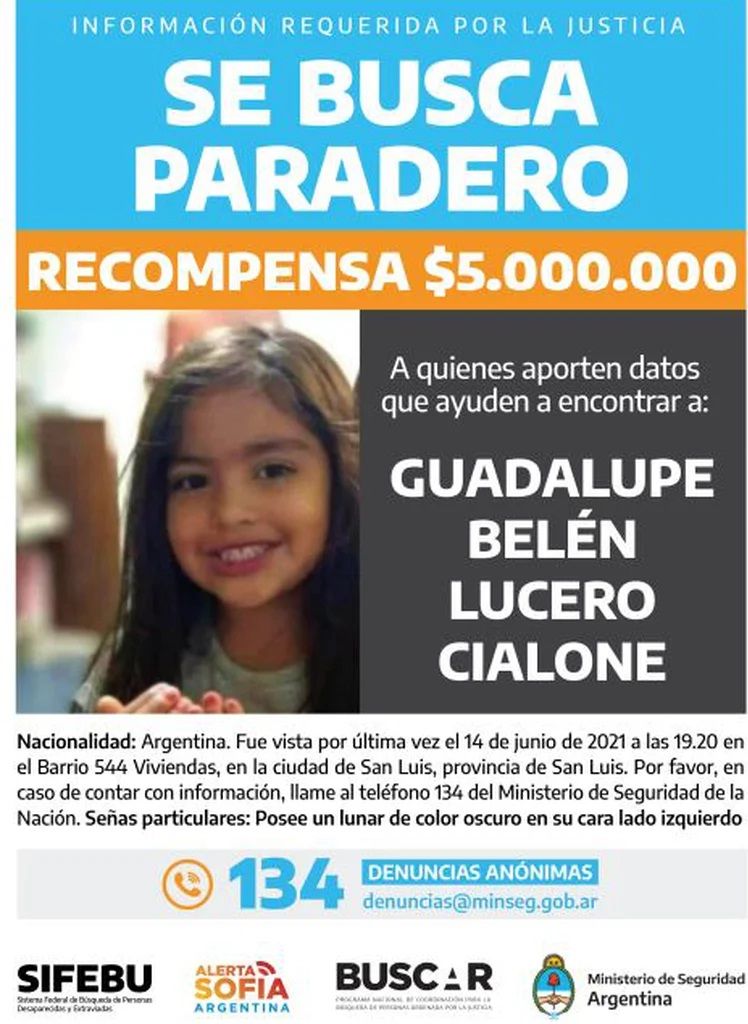 Yamila Cialone es la madre de Guadalupe Belén Lucero, la niña de cinco años que fue vista por última vez el 14 junio del 2021 en la provincia de San Luis. Esta semana, por decisión de la Justicia federal, a cargo de la investigación por la desaparición desde diciembre pasado, se ordenó la realización de nuevos rastrillajes en los que se encontró este martes “una calza pequeña, de color oscuro y rajada, unas botitas número 30 y restos óseos quemados”.