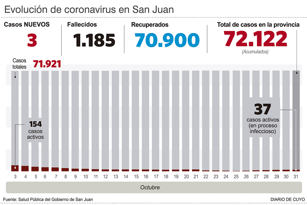El Ministerio de Salud Pública de la provincia informó ayer que se reportaron 3 nuevos contagios por coronavirus y ninguna muerte. A la fecha, la provincia acumula 72.122 casos y 1.185 fallecidos. En tanto que a la fecha hay 39 pacientes internados en las áreas de covid-19 de los hospitales y clínicas locales. De ese total, 12 están graves y 3 de ellos se encuentran con asistencia respiratoria mecánica.