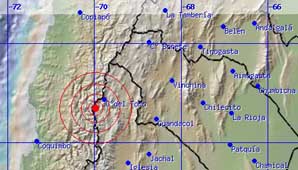 El epicentro se ubicó a 155 km al noroeste de la ciudad de Jáchal en la zona de alta cordillera limítrofe con la República de Chile.