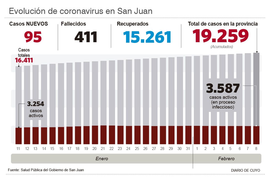 Por otro lado, la tendencia de menos de cien detecciones diarias se mantiene y ayer fueron informados 95 nuevos casos. De esta manera, ahora hay 19.259 confirmados, a poco menos de 11 meses de aquel primer positivo en la provincia.