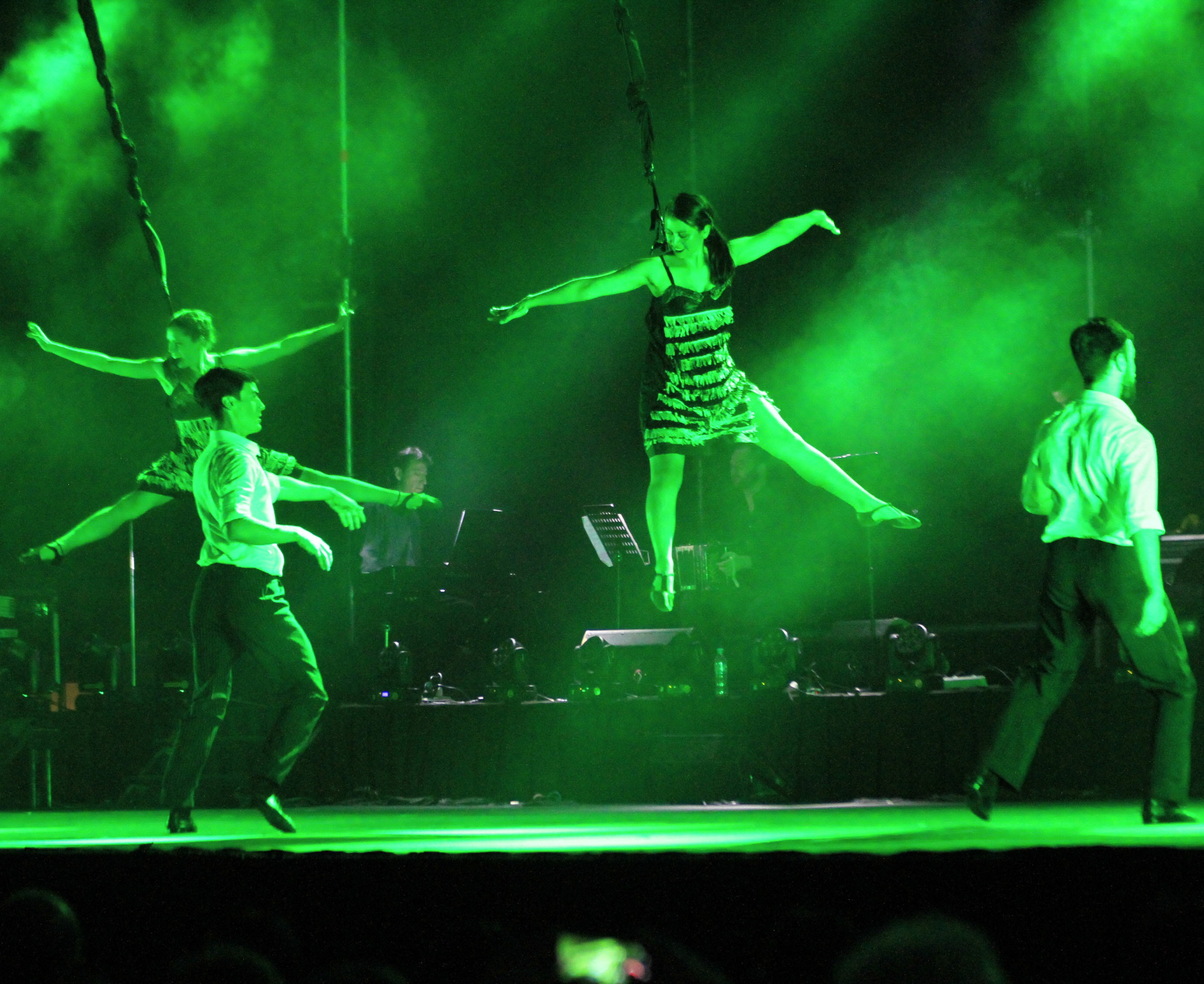 Se adueñó del escenario el grupo de tango aéreo Ocho. Las coreografías de los bailarines sujetados con arnés para desarrollar distintas acrobacias tuvo cautivo a todo el estadio.