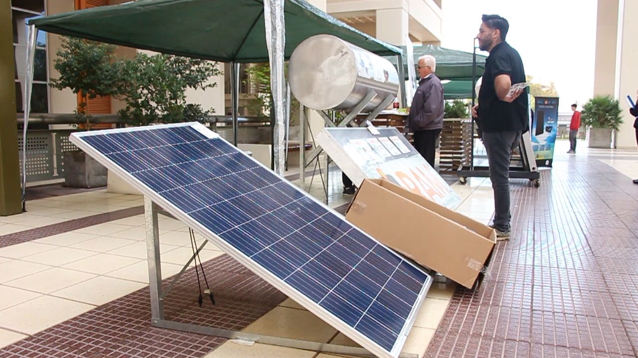 Esta mañana, en la Plaza Seca del Centro Cívico se llevó a cabo una exposición de equipos que funcionan con energía solar. Entre ellos se encuentran los paneles fotovoltaicos que sirven para dar energía eléctrica domiciliaria o industrial y que en este caso son comercializados por la empresa sanjuanina RAM Energy. Cada aparato genera 12 volts y necesita un inversor para lograr su mayor provecho.