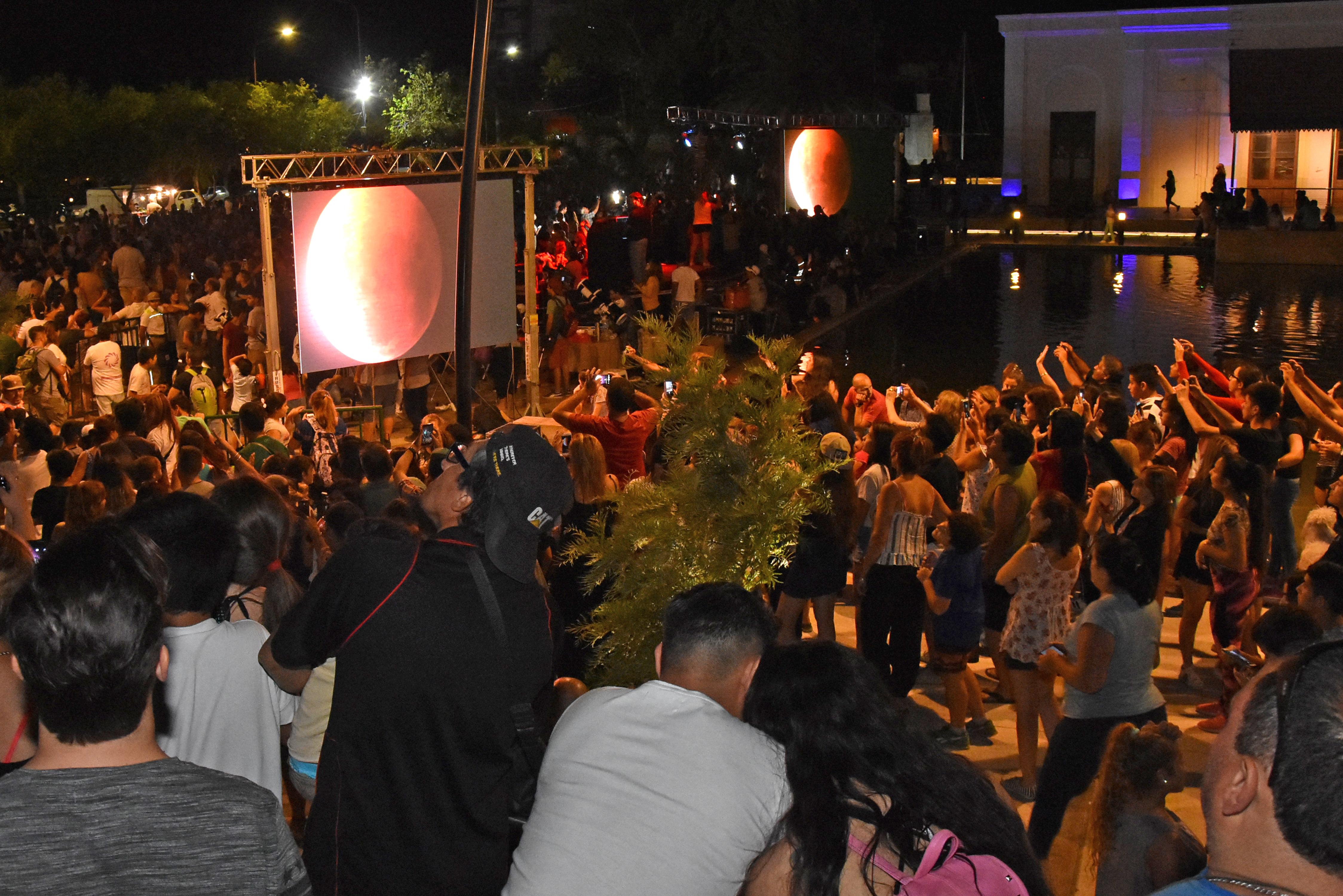 El mayor epicentro de observación local del eclipse total de Luna, que incluyó verla totalmente teñida de rojo, fue una verdadera fiesta en la Plaza del Bicentenario hasta la madrugada de ayer. Cerca de 20.000 personas se reunieron alrededor de la fuente, en las afueras del Teatro, en el andén, en el Puente Cívico, en los jardines del Centro Cívico y en cuanto rincón había disponible para ver el fenómeno. El público, en su mayoría familias con niños chicos, había llevado reposeras, banquitos y muchos de ellos, mesas totalmente armadas en las que pusieron directamente la cena.