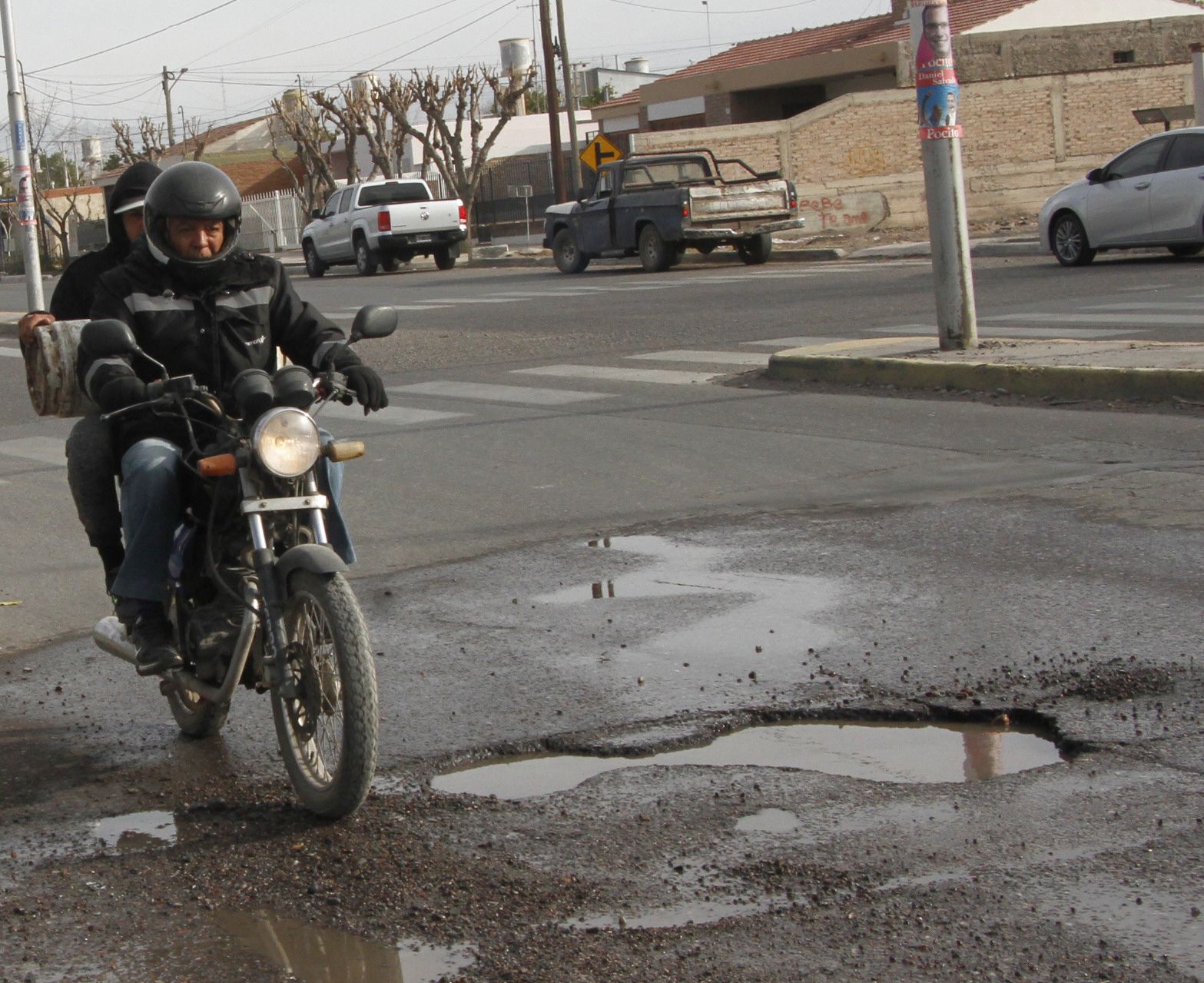 La mujer agregó que el mayor peligro lo protagonizan los conductores que circulan por la calle Salomón Nacusi y que giran hacia el Este cuando llegan a Calle 5, ya que se encuentran con el pozo encima y sin poder esquivarlo. También para los que circulan en moto y en bicicleta, sobre todo cuando comienza a anochecer, ya que dijo que la iluminación no es "muy buena" para distinguir el pozo a tiempo. Contó que la semana pasada un ciclista no pudo evadirlo, se cayó y rompió la rueda delantera de su vehículo.