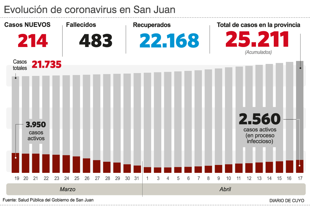En tanto, fueron informados 214 positivos y de esta manera San Juan superó los 25.000 contagios: 25.211 puntualmente. De ellos hay, 2.560 casos activos y 143 internados, de los cuales 78 están en áreas críticas (37 con respirador).