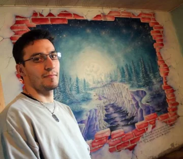 Está a punto de recibirse de profesor de Educación Física y también enseña karate, pero esas dos ocupaciones tan terrenales no le impiden hacerse tiempo para pintar. Lo curioso es que sus obras pueden aparecer en cualquier parte: una puerta, la pared de una casa, el muro de un hospital o el patio de una escuela. "Pinto desde chico. En mi casa siempre nos compraron libros para pintar y hacer cosas manuales y creo que eso me estimuló. En esa época, dibujaba caricaturas de mis dibujos animados favoritos pero después con el tiempo, empecé a pintar otro tipo de personajes imaginarios y fantásticos, que me acompañan hasta hoy", dice.