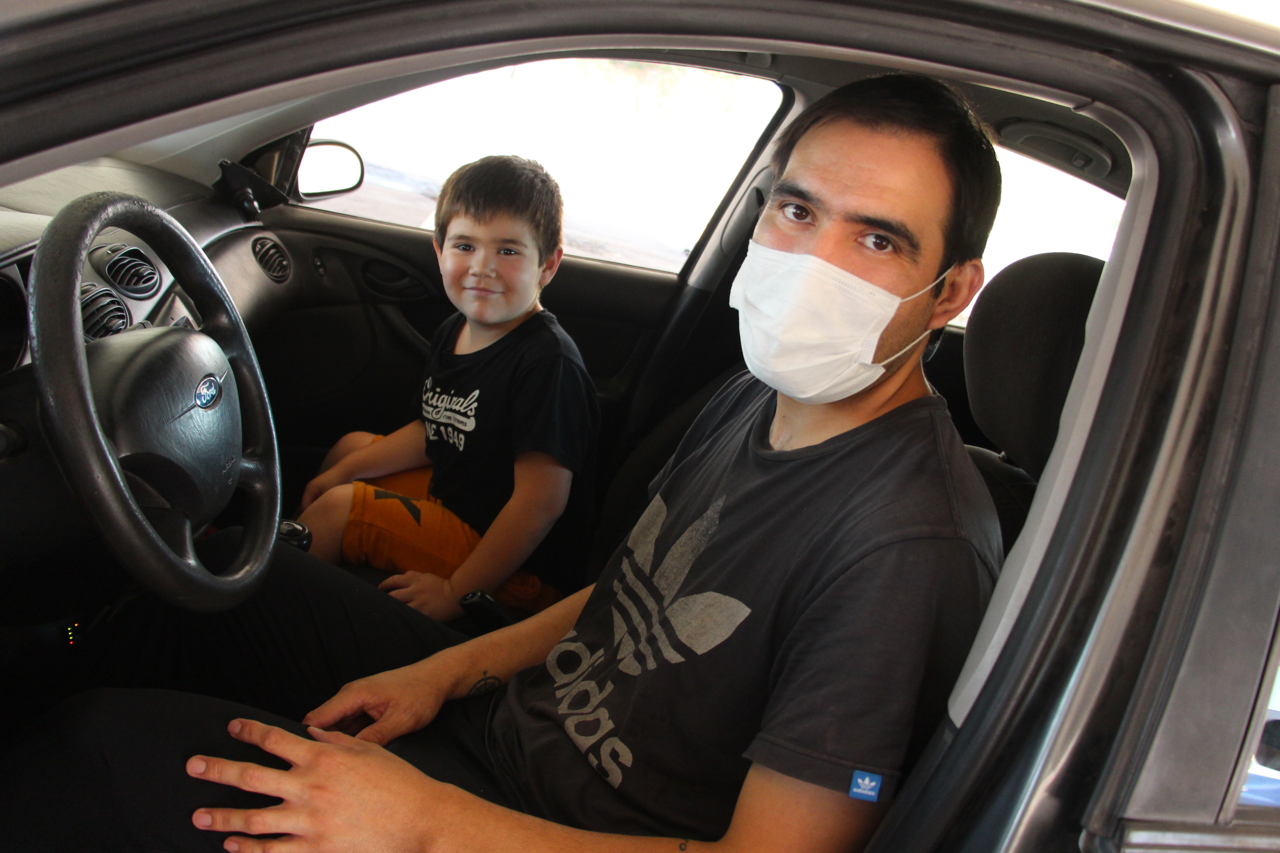 Maximiliano Tortosa es personal de salud y llegó esta mañana en su vehículo particular, acompañado por su hijo Mirko para inocularse la segunda dosis de la vacuna Sputnik V.
