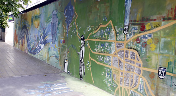 El proyecto fue ideado por el ex presidente de OSSE, Adrián Cuevas, con la finalidad de embellecer el paredón de la vereda sur de Ignacio de la Roza entre Catamarca y Sarmiento. A través de un convenio, la facultad y la repartición financiaron la obra que comenzó a fines de noviembre y recibió las últimas pinceladas el 19 de diciembre pasado.